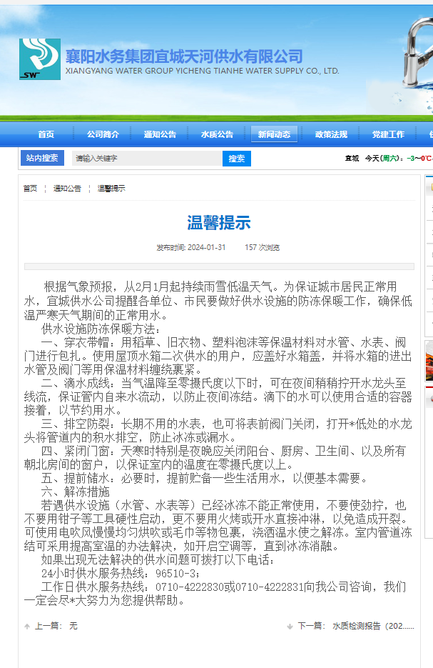 近日,我市出現(xiàn)強降雪天氣,極端低溫天氣易造成供水管網(wǎng)、水表、水龍頭等設施的凍損,影響市民用水安全。為保障全市供水安全穩(wěn)定,宜城天河供水公司堅持提前部署、預防為主、及時搶修原則,扎實做好寒潮及春節(jié)期間保障供水的防御和應對措施準備。